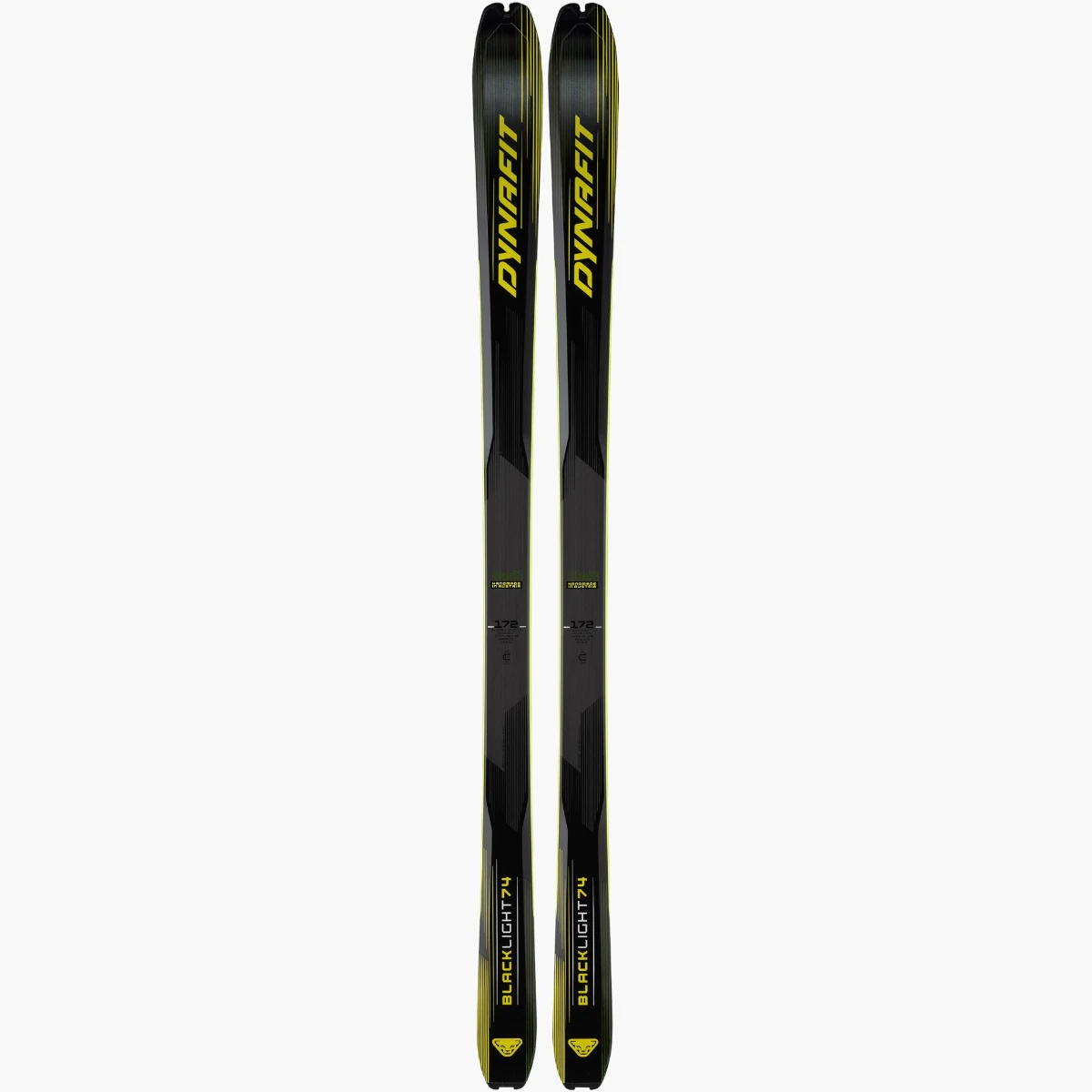 The new DYNAFIT Blacklight 74 gets into the action with 980 grams, that is less than a kilo, and is totally unmatched. The name Blacklight combines the word “black” for its color, which also represents the 100% carbon construction, and the word “light,” meaning it is a very light ski with luminescent character. This model meets the needs of fast, passionate ski tourers who seek a lightweight, easy-handling touring ski for technically demanding terrain. The Blacklight 74 has a 100% carbon top layer. UD is the abbreviation for the one-directional (“uni”) arrangement of the carbon fibers. Compared to classic carbon construction, this engineering lends higher tensile strength and greater durability while maintaining a lower density. Furthermore, the Blacklight 74 comes equipped with a 100% Paulownia wood core. Thanks to its 3D construction, the ski lowers its total weight to reduce its swing weight in front of and behind the binding area. This ensures extremely stable ski handling despite its light weight. The rocker construction at the tip and tail and the sidecut are also adapted for each ski size, a unique feature in the ski touring market. This keeps the effective edge length equally proportional to each size, allowing it to function independently of the size. In order to guarantee the best possible power transfer from skier to ski, the ski is constructed with a full ABS sidewall. In addition, the base, i.e. the surface that contacts the snow, has a special racing grind to ensure you are the fastest one on the mountain. *Binding not included
