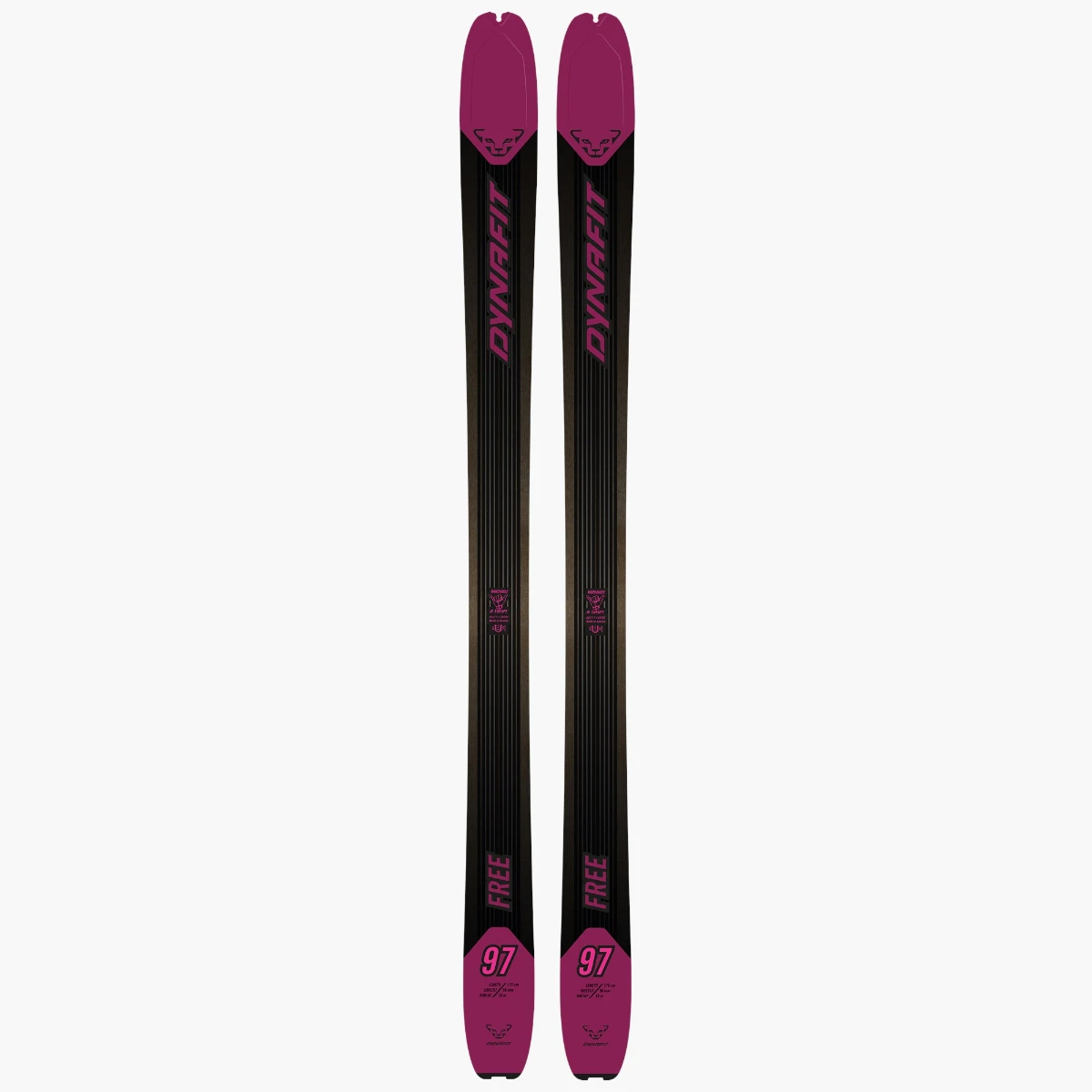Playful, nimble and still stable, too – the new Free 97 W touring skis for women make the pulse of freeskiers race. It magically creates the purest skiing fun in diverse conditions. Their light construction with 100% poplar wood core and the time-tested DYNAFIT carbon speed stringers allows you to save your energy on the climb so you can give it your all on the descent. A modern sidecut and the newly developed rocker at the tip and tail together with a balanced flex for optimum performance characteristics transform these skis into the perfect companion for untouched powder, steep couloirs, and diverse descents. Even in demanding ski conditions or when wearing a heavy backpack, you maintain full control and execute perfect ski turns. The slightly raised tip lends improved turn initiation and easy float. The full sidewalls guarantee direct power transfer to the edges for best performance and stability on both soft snow and hardpack. Free 97 W – for unforgettable powder turns.